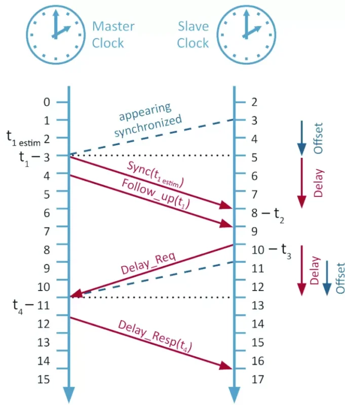 The master clock periodically sends a Sync message to the slave clocks. This message contains the precise time at which it was sent. The slave clocks record the time when they receive this message.